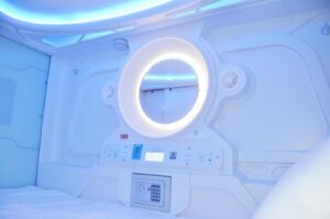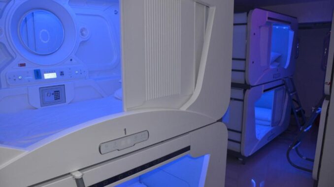 The design mimics a capsule hotel format, offering privacy in shared spaces, ideal for those traveling alone or on a tight schedule.